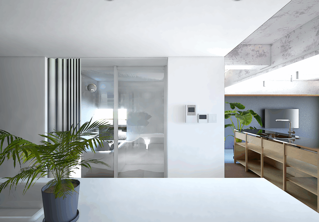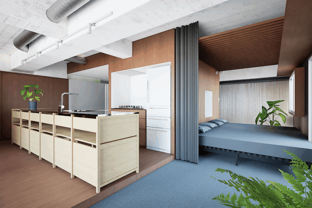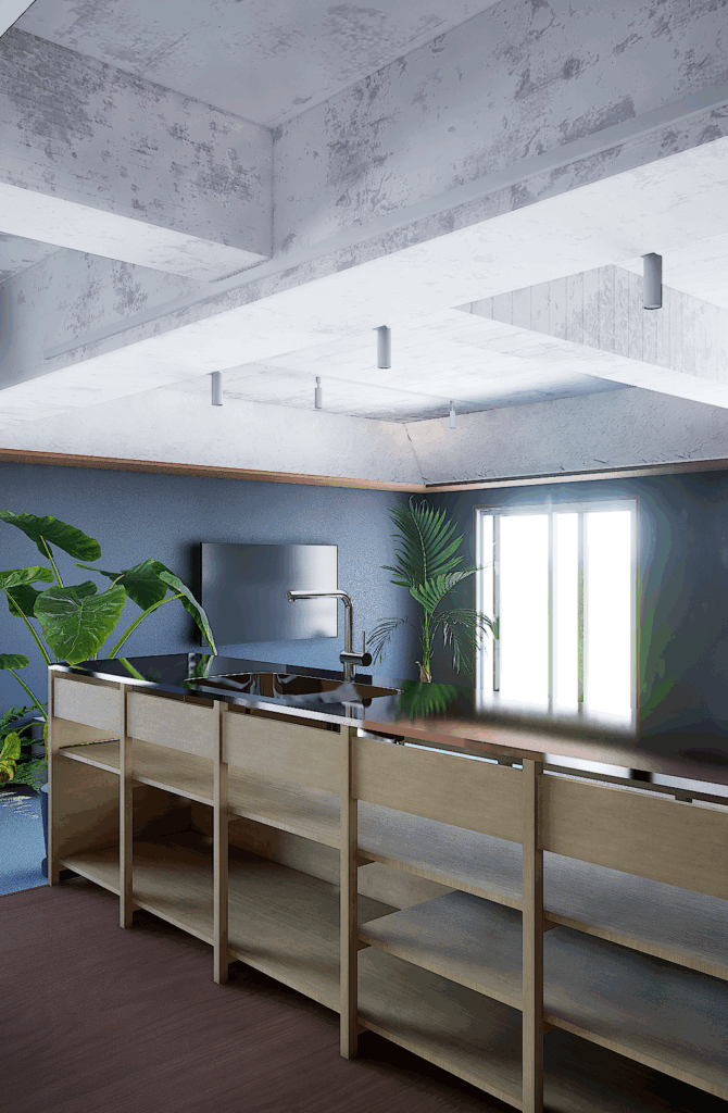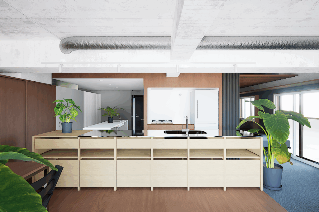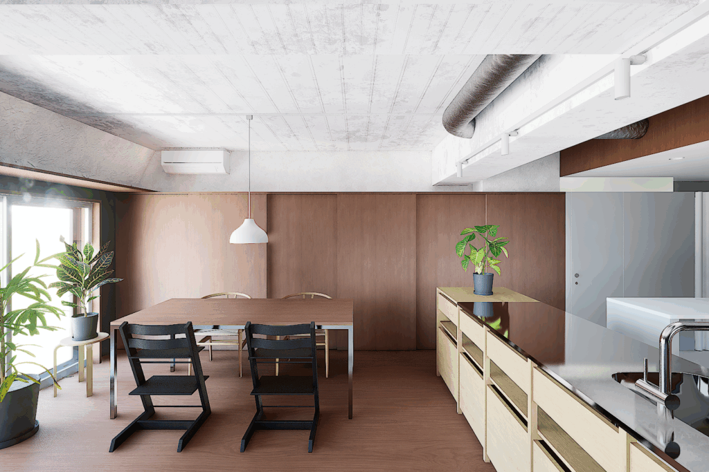 仕上材の切り替えや用途を限定しない家具によって空間を作り、生活の中で様々な使い方や場が生まれてくることを考えています。