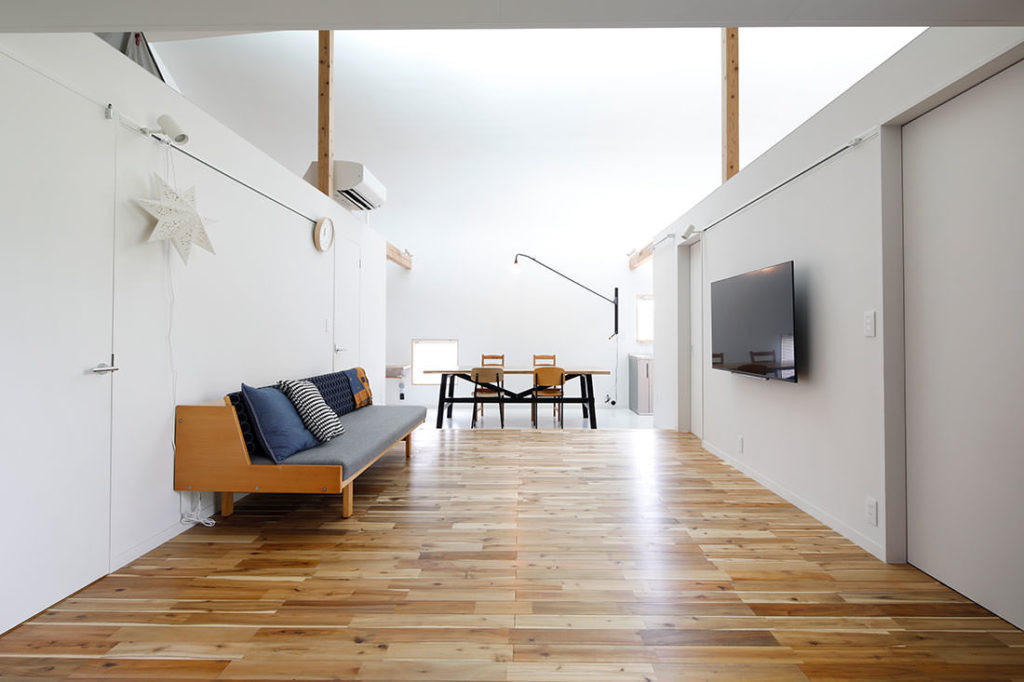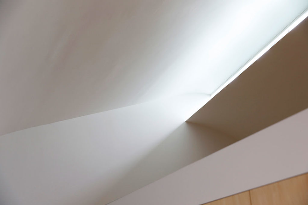 壁面の開口部は最低限に留め、トップライトからメインの採光を取り入れる計画としています。