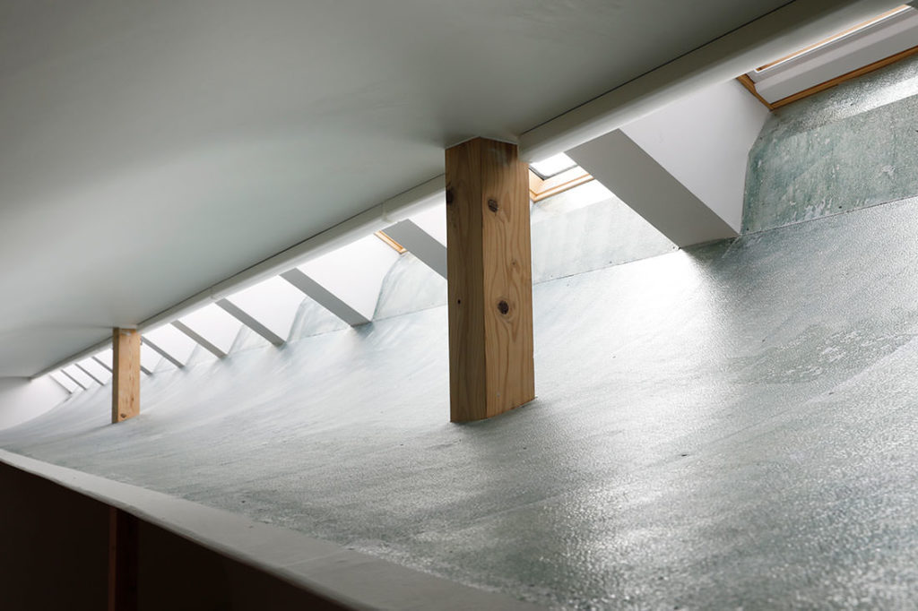 トップライトのすぐ下に熱線吸収塗料を塗った反射板を設け、トップライトから入る光を一度反射板に当てることで